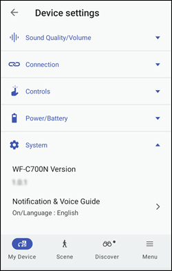 - 在裝置設定選單選擇系統。僅當耳機連線至 Sony | Sound Connect 應用程式時才會顯示此資訊。